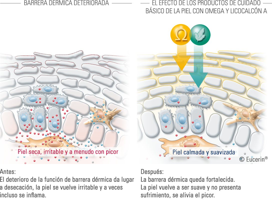 Esto describe el ciclo de constante resecamiento picazón de la piel que experimentan las personas con dermatitis atópica. Comienza la irritación entonces quienes la padecen quieren rascarse. Al rascarse causan inflamación que produce el resecamiento de la piel que conduce a la disfunción de la barrera. Así, uno por vez, aumenta la humedad del ambiente y bacteria staphylococcus aureus coloniza causando irritación y mayor necesidad de rascarse. Y entonces el círculo vicioso continúa.